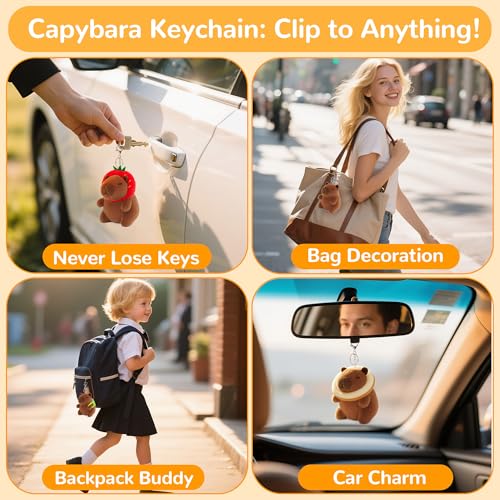 - Capybara Keychain for Bags & Backpacks: Each capybara cute keychain measures about 5 inches—the perfect size to clip onto backpacks, handbags, and keys. These portable capybara stuffed animal buddies are easy to carry, making them cute travel companions for school, road trips, and vacations.